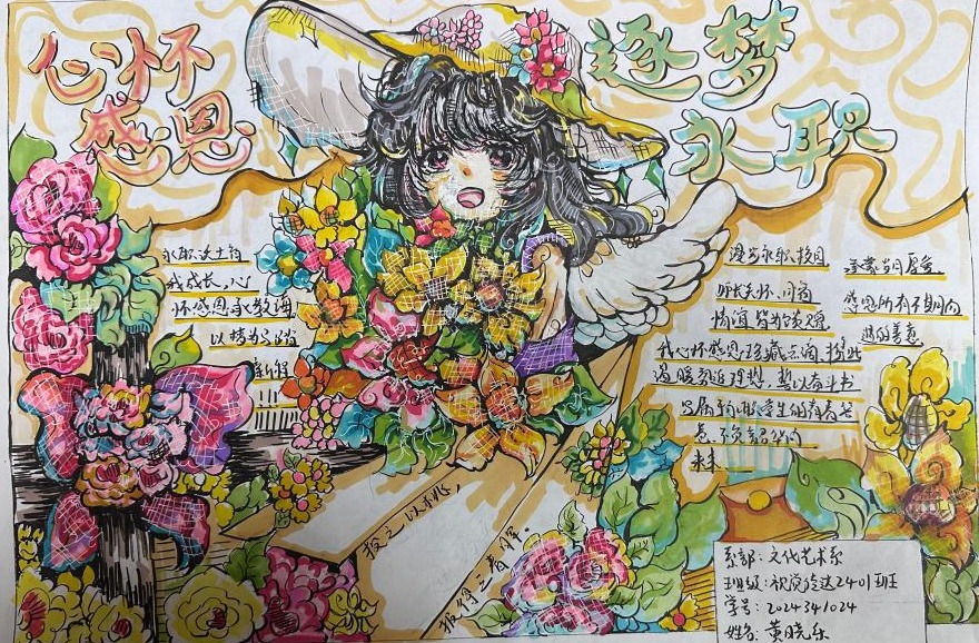 为培育大学生感恩情怀,凝聚逐梦力量,厚植爱校荣校情感,响应学校学生资助管理中心号召,近日,文化艺术系精心策划的“心怀感恩·逐梦永职”主题手抄报评选大赛圆满落下帷幕。本次大赛以笔为媒、以画传情,为全系学子搭建了抒发心声、展现才华的平台,进一步丰富了校园文化生活,彰显了文化艺术系的专业育人特色。